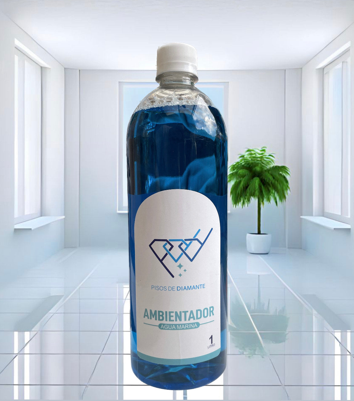 Delicioso ambientador con aroma agua marina que limpia, perfuma y desinfecta pisos, baños y cocinas, no requiere enjuague.